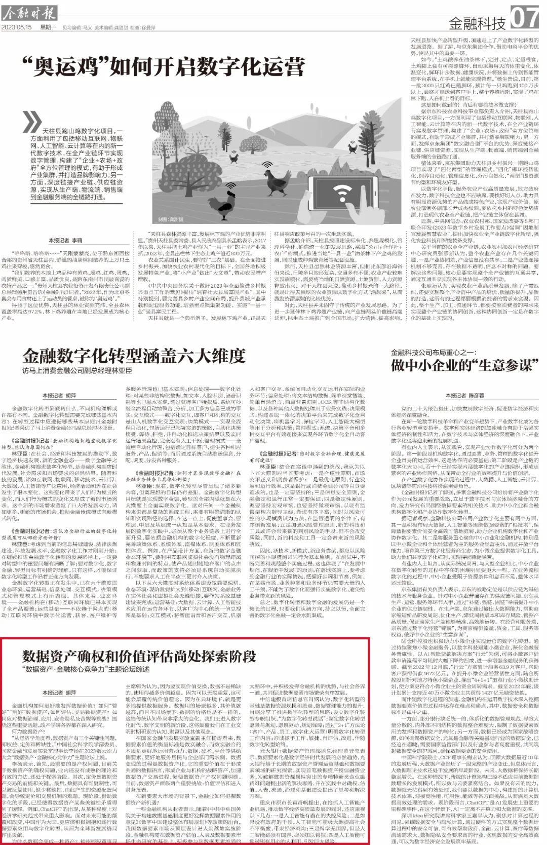 一些金融机构从业者表示,随着《中共中央国务院关于构建数据基础制度更好发挥数据要素作用的意见》《数字中国建设整体布局规划》等政策的出台,我国数据要素市场从顶层设计进入到落地实施阶段,金融机构需在数据资产估值、入表及数据要素市场生态研究的基础上,积极参与到数据要素流通的大循环中,并积极发挥金融机构的优势,与社会各界一道,共同促进数据要素市场繁荣有序发展。